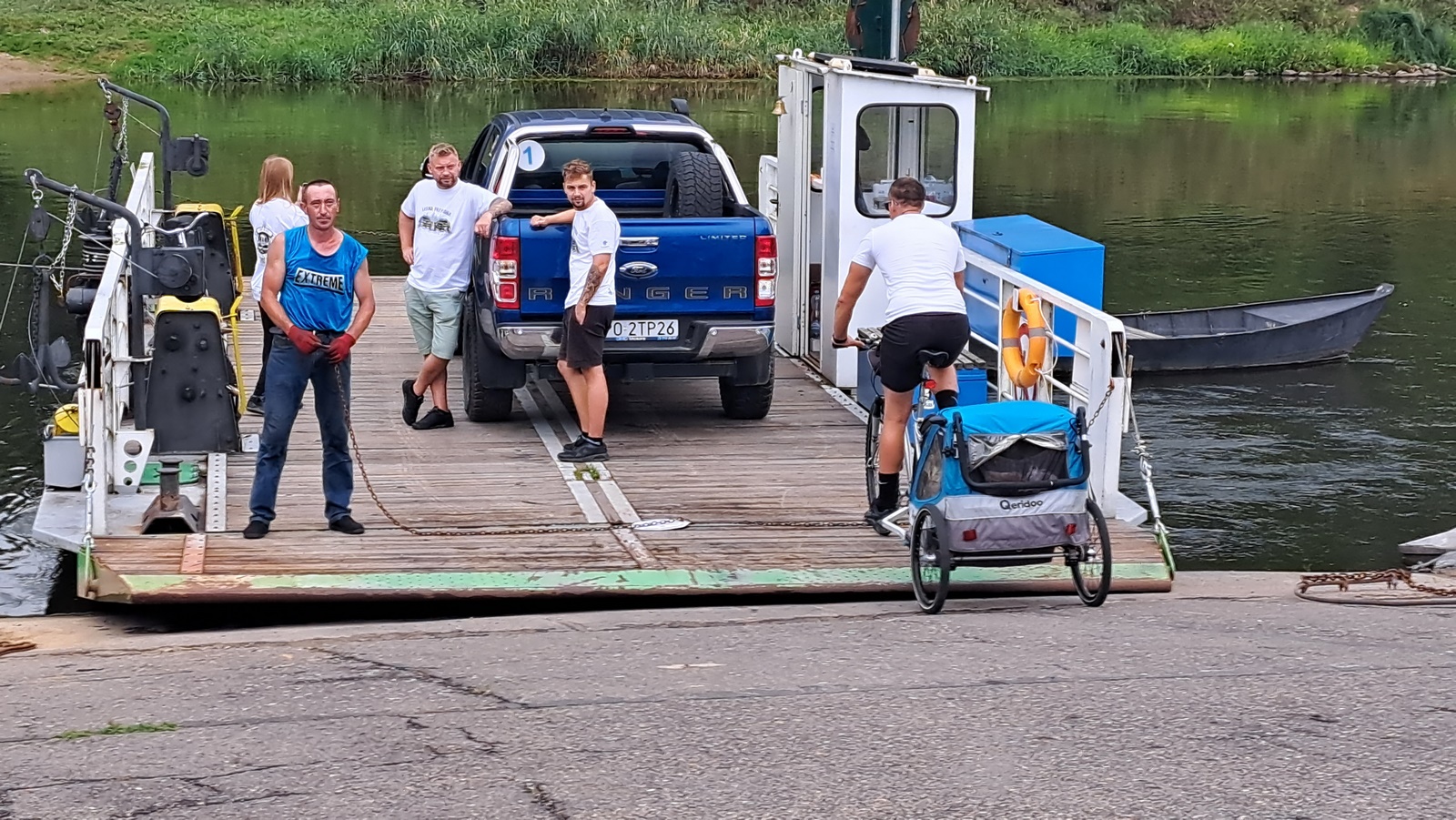 Unterwegs musste ich eine Fähre, für Fährbetrieb sehr kleinen Bach queren. Ich hatte während der Überfahrt immer das Portemonai in der Hand und war dann überrascht, dass ich es nicht brauchte obwohl der Fährmann vorne in blau von der strengen Arbeit richtig schweissgebadet war.