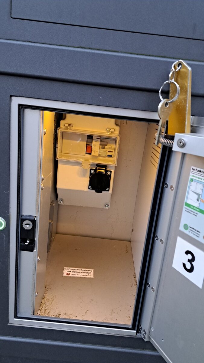 Die Akkus werden eingeschlossen, mit einem Code gesichert und werden geladen. Eine „Tankfüllung“ ist nicht vergleichbar zum E-Auto. Diese ist nähmlich gratis.